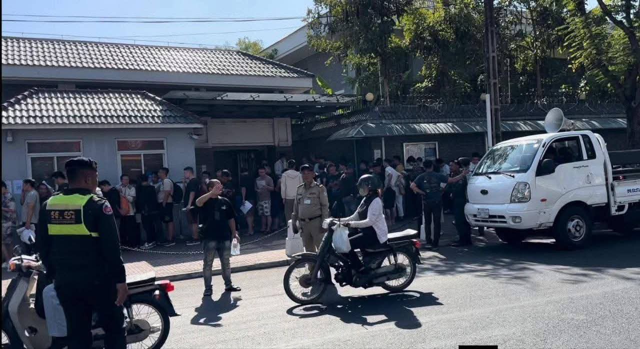 ភ្នំពេញ ៖ ជនជាតិចិនជាង៣០០នាក់ នៅដេក ឈរ ប្រមូលផ្តុំគ្នាខាងមយខស្ថានទូតចិន ត្រូវបានសមត្ថកិច្ចប្រមូលនាំយកទៅស្នាក់នៅបណ្តោះអាសន្ន នៅព្រលានយន្តហោះពោធិ៍ចិនតុងចាស់ នារសៀលថ្ងៃទី២៤ ខែមករា ឆ្នាំ២០២៦ ។
