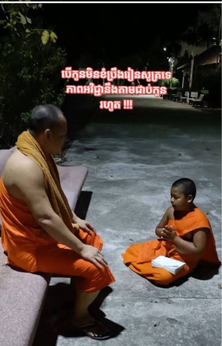 ទើបអាយុ១១ឆ្នាំក៏កំព្រាម្តាយហើយ ពេលនេះបួសបាន១វស្សាហើយ សុំទូស័ព្ទលោកគ្រូខលមកញោមមីងសួរពីអាយុនិងកំពស់ ខ្ញុំសួរលោកកូនសួរយកទៅណា? លោកកូនថា ពរញោម សាលាឲ្យតែងសេក្តីពីញោមម៉ែ ត្មាក៏តែងពីញោមមីងទៅ និយាយដល់ត្រឹមនេះលោកកូនស្ងាត់មាត់១ស្របក់ ខ្ញុំដឹងថាលោកកូនកំពុងសំរួលអារម្មណ៍ដើម្បីមានសង្សដិកាបន្តទៀត..😥😥