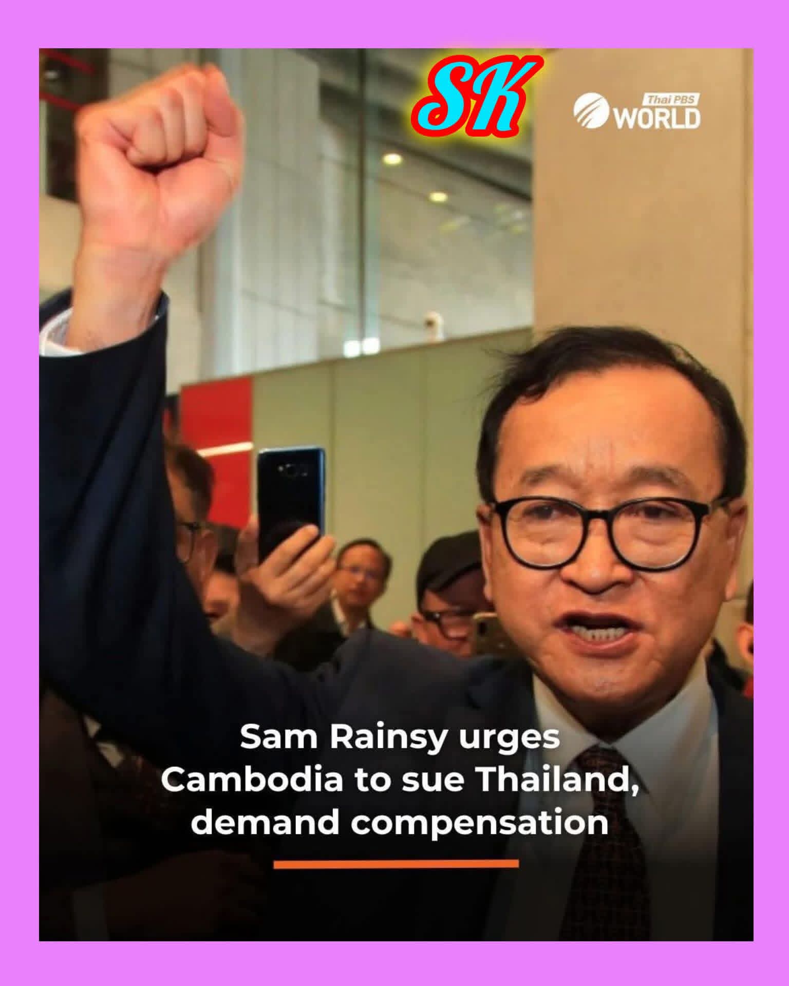 សារព័ត៌មានថៃ ផ្សាយថាលោក សម រង្សុី មេបក្សជំទាស់និរទេសខ្លួនក្រៅស្រុក ទាមទារឱ្យថៃសងលើការខូចខាត ស្ពាន ប្រាសាទ សាលារៀន វត្តអារាម ផ្លូវថ្នល់ផ្ទះសម្បែងទ្រព្យសម្បត្តិប្រជាពលរដ្ឋ ។ល។ ក្នុងសង្រ្គាមឈ្លានពាន ដោយ ប្តឹងថៃទៅតុលាការព្រហ្មទណ្ឌអន្តរជាតិ ICC ,ICJ ដើម្បីរកយុត្តិធម៏ជូនកម្ពុជា ។