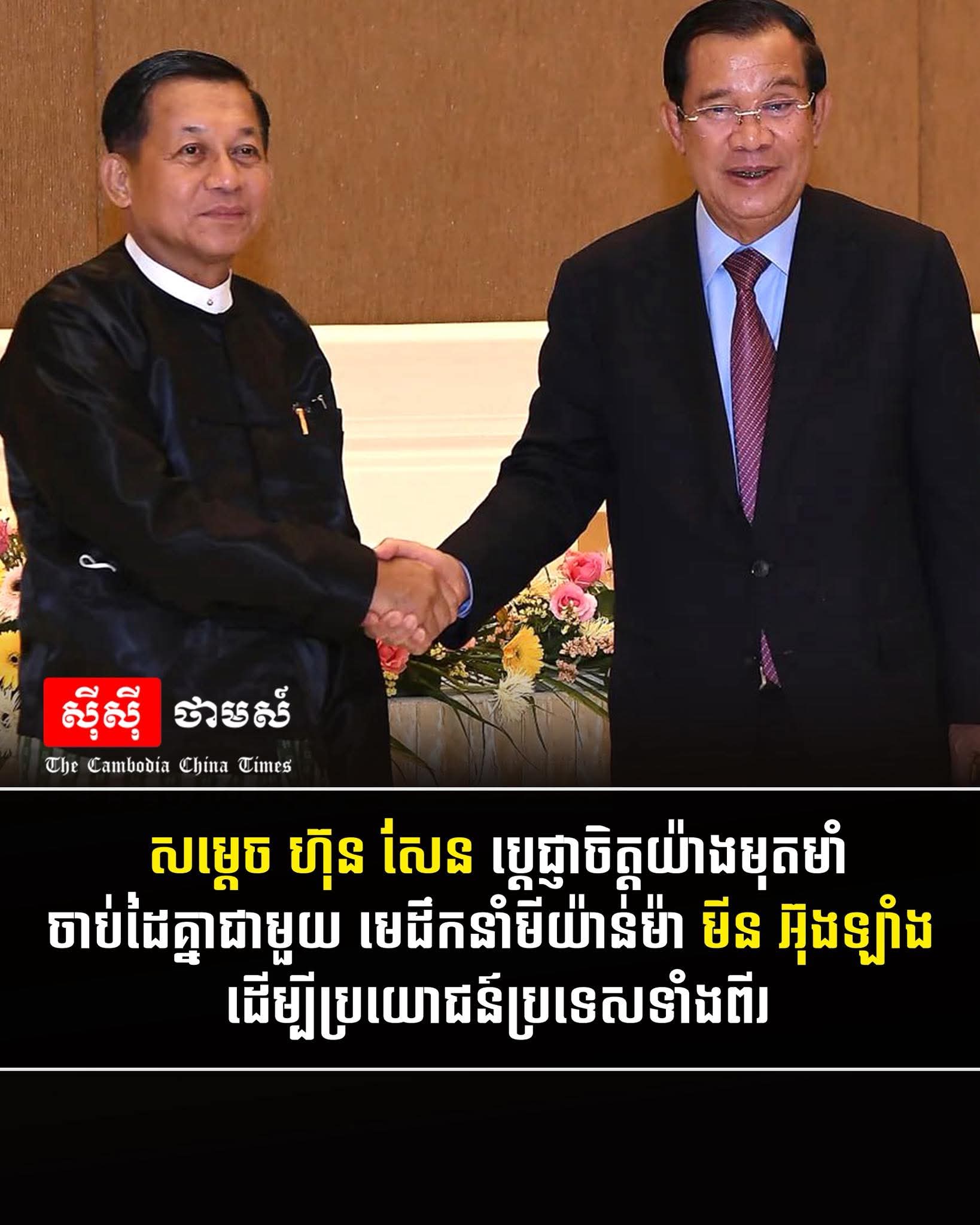 សម្តេច ហ៊ុន សែន ប្រធានព្រឹទ្ធសភាកម្ពុជា បានបញ្ជាក់នូវការប្តេជ្ញាចិត្តយ៉ាងមុតមាំជាមួយមេដឹកនាំមីយ៉ាន់ម៉ា លោក មីន អ៊ុងឡាំង ក្នុងការបន្តធ្វើការយ៉ាងជិតស្និទ្ធជាមួយគ្នា ដើម្បីបង្កើនចំណងមិត្តភាពទ្វេភាគី និងពហុភាគី ដើម្បីបម្រើឧត្តមប្រយោជន៍របស់ប្រទេសទាំងពីរ។ ការបញ្ជាក់នេះធ្វើឡើងក្នុងសារលិខិតអបអរសាទររបស់សម្តេច ហ៊ុន សែន ជូនចំពោះលោក មីន អ៊ុងឡាំង ក្នុងឱកាសខួបលើកទី៧៨ នៃទិវាបុណ្យឯករាជ្យ នៃសាធារណរដ្ឋសហភាពមីយ៉ាន់ម៉ា។