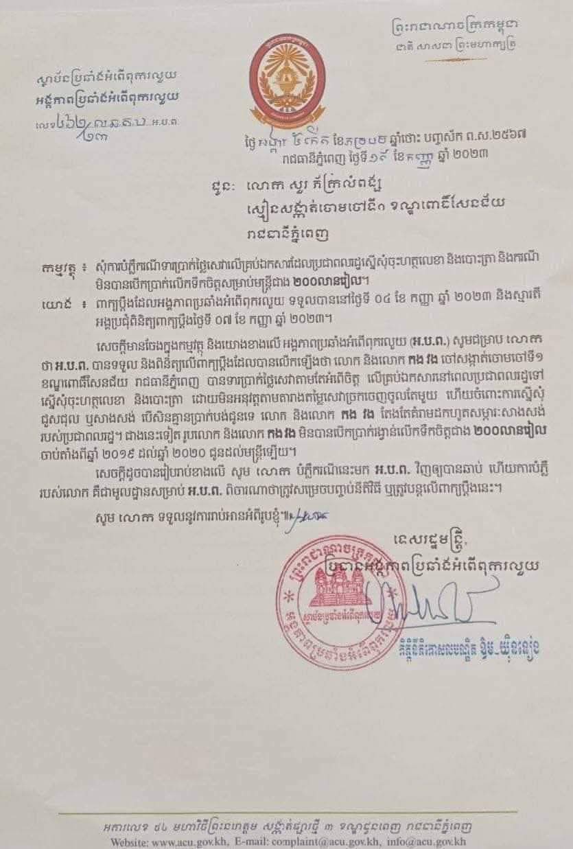 ក្នុងលិខិត អង្គភាព ACU បានបញ្ជាក់ថា ខ្លួនបានទទួល និងពិនិត្យលើពាក្យប្ដឹងដែលបានលើកឡើងថា លោក សួរ ភ័ក្រសំពង្ស ស្មៀនសង្កាត់ចោមចៅទី១ និងលោក កង វង ចៅសង្កាត់ចោមចៅទី១ ខណ្ឌពោធិ៍សែនជ័យ រាជធានីភ្នំពេញ បានទារប្រាក់ថ្លៃសេវាតាមតែអំពើចិត្ត លើគ្រប់ឯកសារនៅពេលប្រជាពលរដ្ឋទៅ ស្នើសុំចុះហត្ថលេខា និងបោះត្រា ដោយមិនអនុវត្តតាមតារាងតម្លៃសេវាច្រកចេញចូលតែមួយ ហើយចំពោះការស្នើសុំ ជួសជុល ឬសាងសង់ បើសិនគ្មានប្រាក់បង់ជូនទេ លោក និងលោក កង វង តែងតែគំរាមដកហូតសម្ភារៈសាងសង់ របស់ប្រជាពលរដ្ឋ។