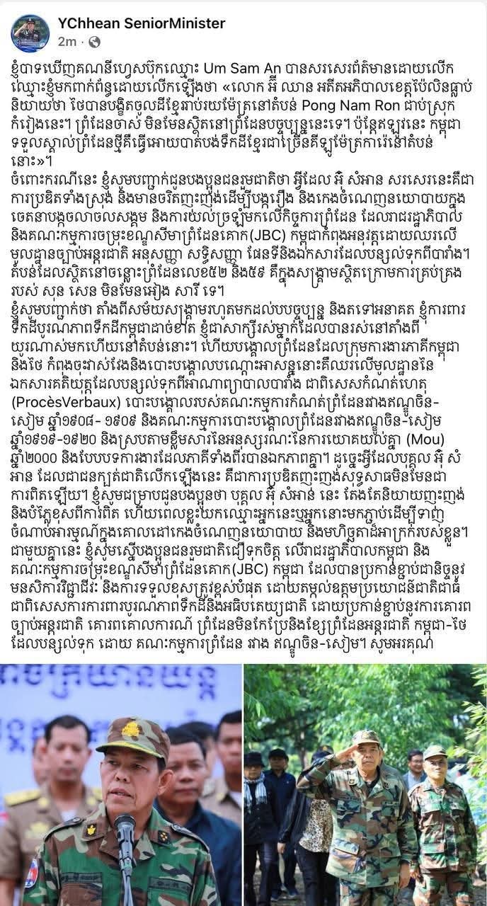 ខ្ញុំសូមបញ្ជាក់ថា តាំងពីសម័យសង្គ្រាមរហូតមកដល់បបច្ចុប្បន្ន និងតទៅអនាគត ខ្ញុំការពារទឹកដីបូរណភាពទឹកដីកម្ពុជាដាច់ខាត ខ្ញុំជាសាក្សីរស់ម្នាក់ដែលបានរស់នៅតាំងពីយូរណាស់មកហើយនៅតំបន់នោះ។ ហើយបង្គោលព្រំដែនដែលក្រុមការងារភាគីកម្ពុជានិងថៃ កំពុងចុះវាស់វែងនិងបោះបង្គោលបណ្តោះអាសន្ននោះគឺឈរលើមូលដ្ឋាននៃឯកសារគតិយុត្តដែលបន្សល់ទុកពីអាណាព្យាបាលបារាំង ជាពិសេសកំណត់ហេតុ (ProcèsVerbaux) បោះបង្គោលរបស់គណៈកម្មការកំណត់ព្រំដែនរវាងឥណ្ឌូចិន- សៀម ឆ្នាំ១៩០៨- ១៩០៩ និងគណៈកម្មការបោះបង្គោលព្រំដែនរវាងឥណ្ឌូចិន-សៀម ឆ្នាំ១៩១៩-១៩២០ និងស្របតាមខ្លឹមសារនៃអនុស្សរណៈនៃការយោគយល់គ្នា (Mou) ឆ្នាំ២០០០ និងបែបបទការងារដែលភាគីទាំងពីរបានឯកភាពគ្នា។ ដូច្នេះអ្វីដែលបុគ្គល អ៊ុំ សំអាន ដែលជាជនក្បត់ជាតិលើកឡើងនេះ គឺជាការប្រឌិតញុះញង់សុទ្ធសាធមិនមែនជាការពិតឡើយ។ ខ្ញុំសូមជម្រាបជូនបងប្អូនថា បុគ្គល អ៊ុំ សំអាន នេះ តែងតែនិយាយញុះញង់និងបំភ្លៃខុសពីការពិត ហើយពេលខ្លះយកឈ្មោះអ្នកនេះឬអ្នកនោះមកភ្ជាប់ដើម្បីទាញចំណាប់អារម្មណ៍ក្នុងគោលដៅកេងចំណេញនយោបាយ និងមហិច្ឆតាដ៏អាក្រក់របស់ខ្លួន។