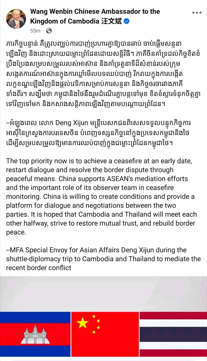 ភារកិច្ចបន្ទាន់ គឺត្រូវបញ្ឈប់ការបាញ់ប្រហារគ្នាឱ្យបានឆាប់ ចាប់ផ្តើមសន្ទនាឡើងវិញ និងដោះស្រាយជម្លោះព្រំដែនដោយសន្តិវិធី។ ភាគីចិនគាំទ្រដល់កិច្ចខិតខំប្រឹងប្រែងសម្របសម្រួលរបស់អាស៊ាន និងគាំទ្រតួនាទីដ៏សំខាន់របស់ក្រុមសង្កេតការណ៍អាស៊ានក្នុងការឃ្លាំមើលបទឈប់បាញ់ រីករាយក្នុងការបង្កើតលក្ខខណ្ឌឡើងវិញនិងផ្តល់វេទិកាសម្រាប់ការសន្ទនា និងកិច្ចចរចារវាងភាគីទាំងពីរ។ សង្ឃឹមថា កម្ពុជានិងថៃនឹងរួមដំណើរគ្នាបន្តទៅមុខ ខិតខំស្តារទំនុកចិត្តគ្នាទៅវិញទៅមក និងកសាងសន្តិភាពឡើងវិញតាមបណ្តោយព្រំដែន។