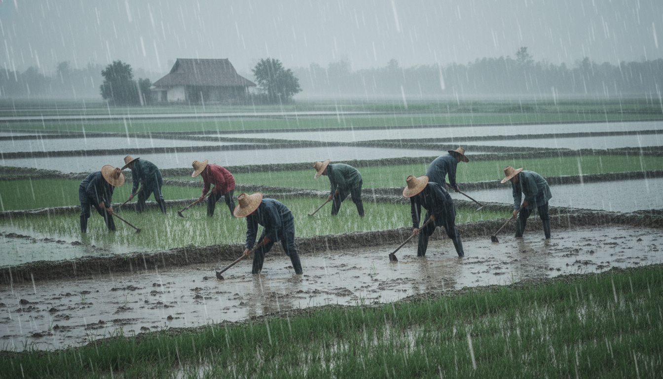 អ្នកធ្វើស្រែធ្វើស្រូវទាំងមេឃកំពុងតែភ្លៀង