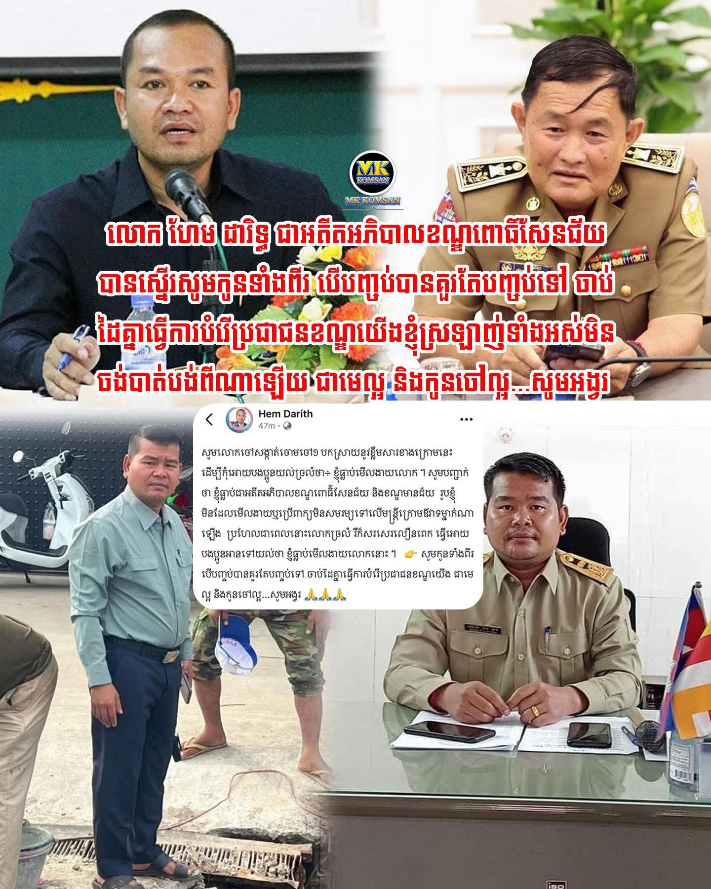ពោធិ៍សែនជ័យ បានស្នើ រសូមកូនទាំងពីរ បើបញ្ចប់បានគួរតែបញ្ចប់ទៅ ចាប់ដៃគ្នាធ្វើការបំរើប្រជាជនខណ្ឌយើងខ្ញុំស្រឡាញ់ទាំងអស់មិនចង់បា…ត់ប… ង់ពីណាឡើយ ជាមេល្អ និងកូនចៅល្អ...សូមអង្វរ👏