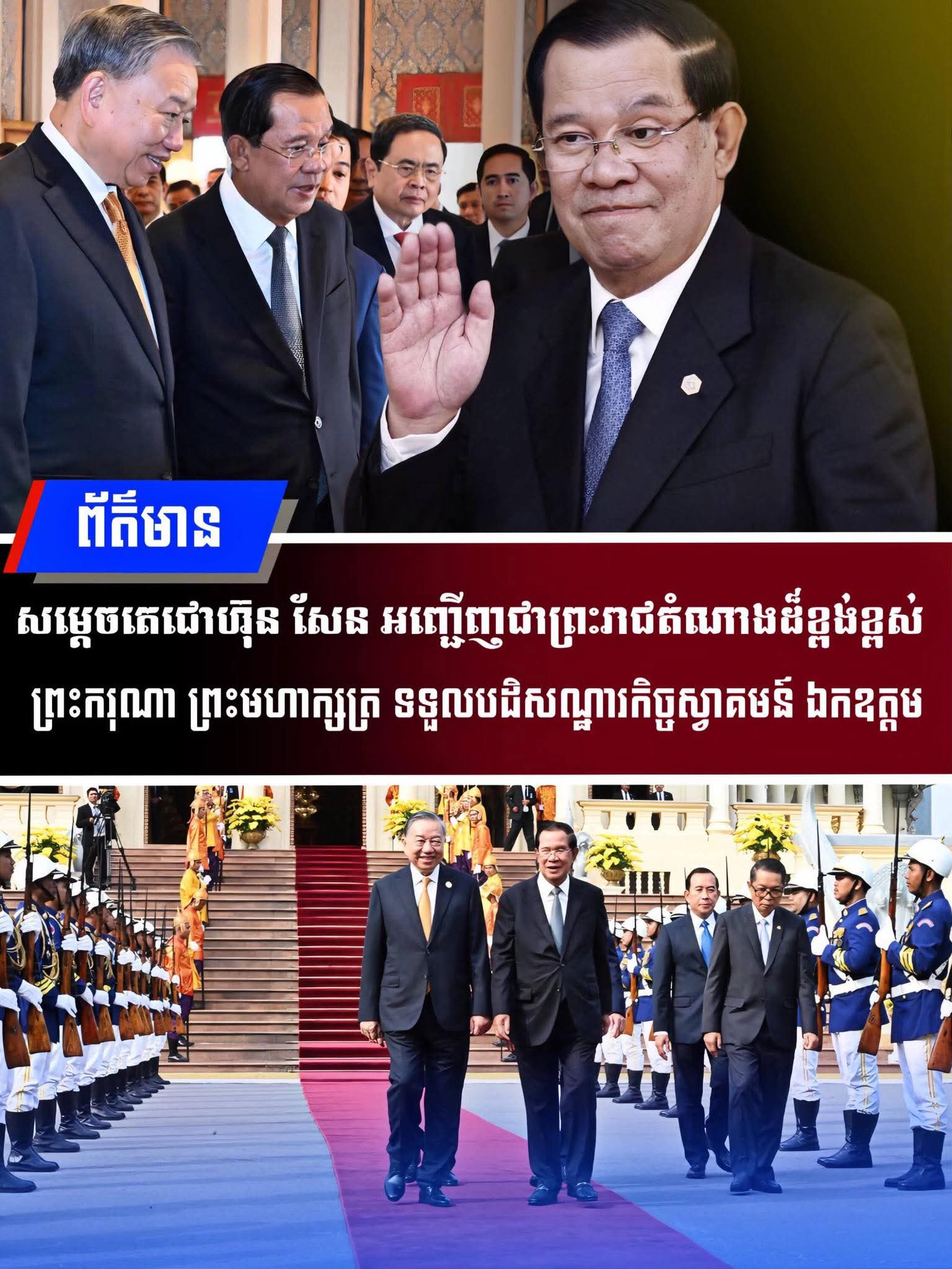 នៅព្រះបរមរាជវាំង នាព្រឹកថ្ងៃសុក្រ ទី៦ ខែកុម្ភៈ ឆ្នាំ២០២៦នេះ សម្ដេចអគ្គមហាសេនាបតីតេជោ ហ៊ុន សែន ប្រធានព្រឹទ្ធសភានៃព្រះរាជាណាចក្រកម្ពុជា បានអញ្ជើញជាព្រះរាជតំណាងដ៏ខ្ពង់ខ្ពស់បំផុត របស់ព្រះករុណាព្រះបាទសម្ដេចព្រះបរមនាថ នរោត្តម សីហមុនី ព្រះមហាក្សត្រនៃព្រះរាជាណាចក្រកម្ពុជា ទទួលបដិសណ្ឋារកិច្ចស្វាគមន៍ផ្លូវរដ្ឋជូន ឯកឧត្តម តូ ឡឹម អគ្គលេខាធិការបក្សកុម្មុយនីស្តវៀតណាម ជាមួយនឹងជំនួបសាវនាកាផងដែរ ក្នុងឱកាសដែល ឯកឧត្តម អញ្ជើញបំពេញទស្សនកិច្ចផ្លូវរដ្ឋនៅកម្ពុជា។