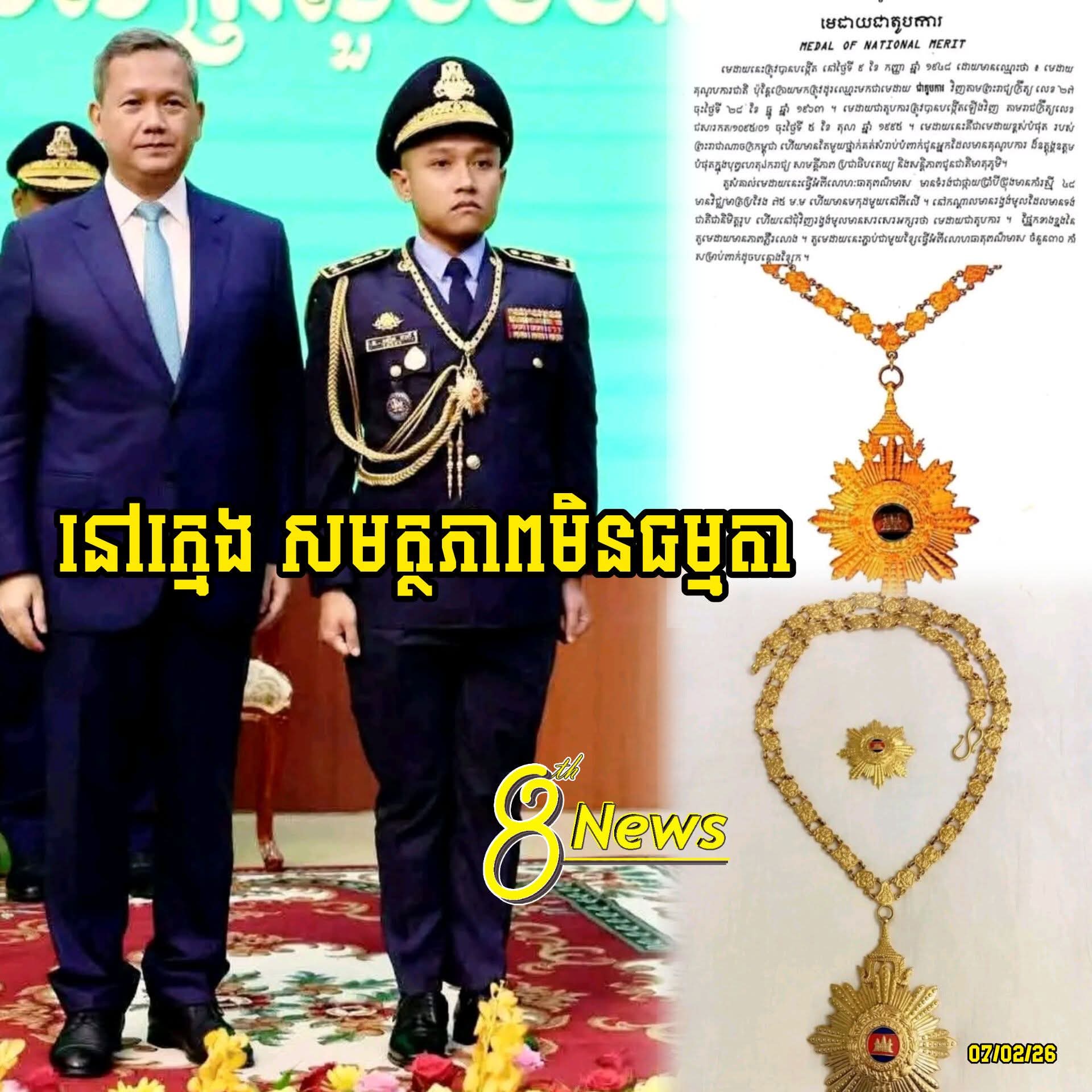 បើមើលគ្រឿងឥស្សរិយយសដែលសម្តេចធិបតីនាយករដ្ឋមន្ត្រី បំពាក់ជូនក្មួយម្នាក់នេះ ប្រហែលជាគ្រឿងឥស្សរិយយស «ជាតូបការ» ហើយមើលទៅ។ ក្មួយម្នាក់នេះ ពាក់ផ្កាយ២ ហើយទទួលគ្រឿងឥស្សរយយសជាតូបការទៀត គឺមិនធម្មតាទេ ក្មួយពិតជាមានគុណបំណាច់ដ៏មហាធំធេងចំពោះជាតិមាតុភូមិហើយមើលទៅ ទើបធំទាំងផ្កាយ ធំទាំងគ្រឿងឥស្សរិយយសដូច្នេះ។ សូមអបអរសាទរក្មួយ, សូមក្មួយខិតខំធ្វើការបន្ថែមទៀតដើម្បីជាតិ សាសនា ព្រះមហាក្សត្រ និងឧត្តមប្រយោជន៍ជាតិ មាតុភូមិ និងប្រជាជន!