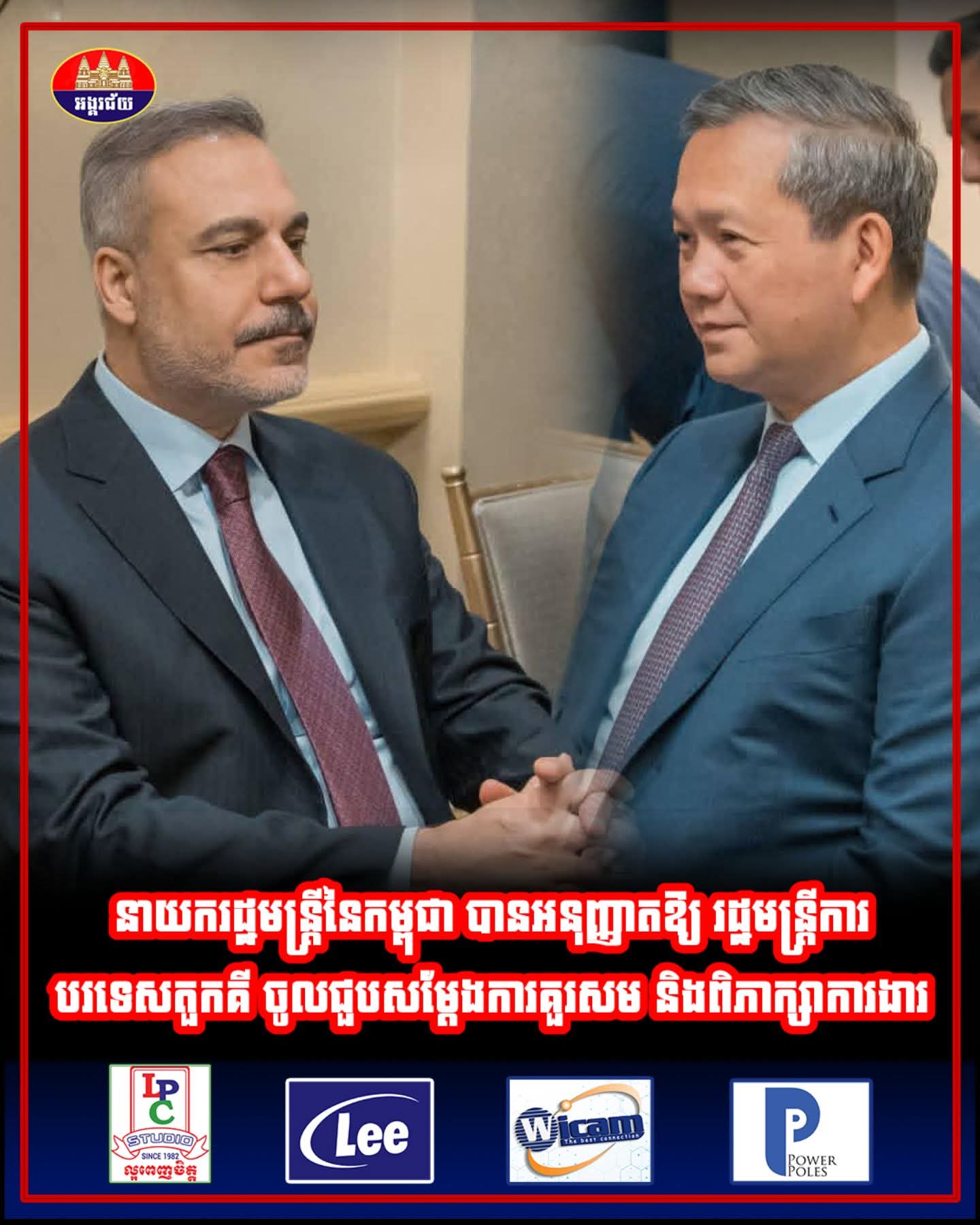 សម្តេចមហាបវរធិបតី ហ៊ុន ម៉ាណែត នាយករដ្ឋមន្ត្រីនៃកម្ពុជា បានអនុញ្ញាតឱ្យឯកឧត្តម Hakan Fidan រដ្ឋមន្ត្រីការបរទេសតួកគី ចូលជួបសម្តែងការគួរសម និងពិភាក្សាការងារ។